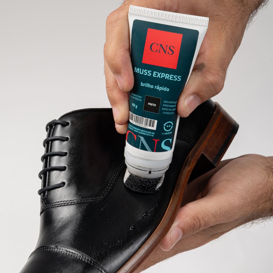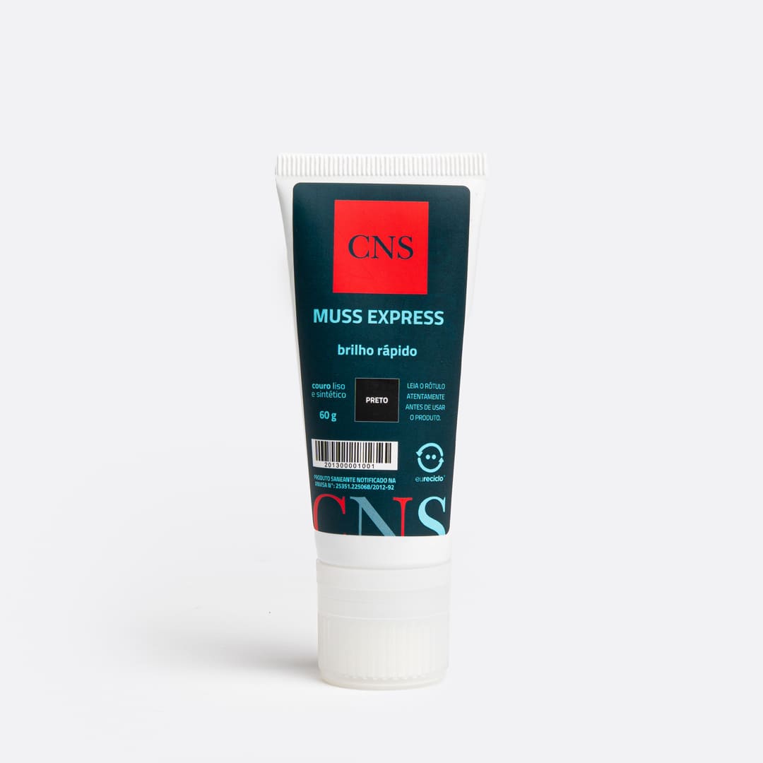 SOBRE O MUSS EXPRESS: Produto para polimento a base de ceras naturais e água. Pela sua formulação, recupera o brilho, a flexibilidade e hidratação natural de calçados em couro liso, podendo também ser utilizado em materiais sintéticos, tendo altíssimo rendimento e prolongada permanência sobre as superfícies tratadas. Não agride o couro. Fabricado em diversas cores, permite perfeita adaptação às cores originais, amaciando o couro a cada aplicação. De aplicação prática, hidrata o couro e cobre arranhões (exceto incolor).