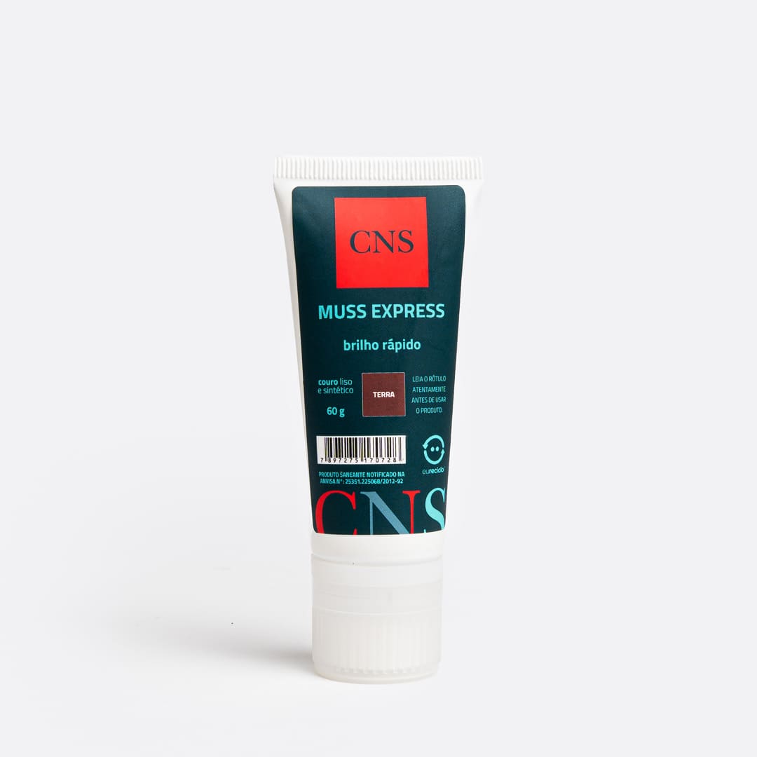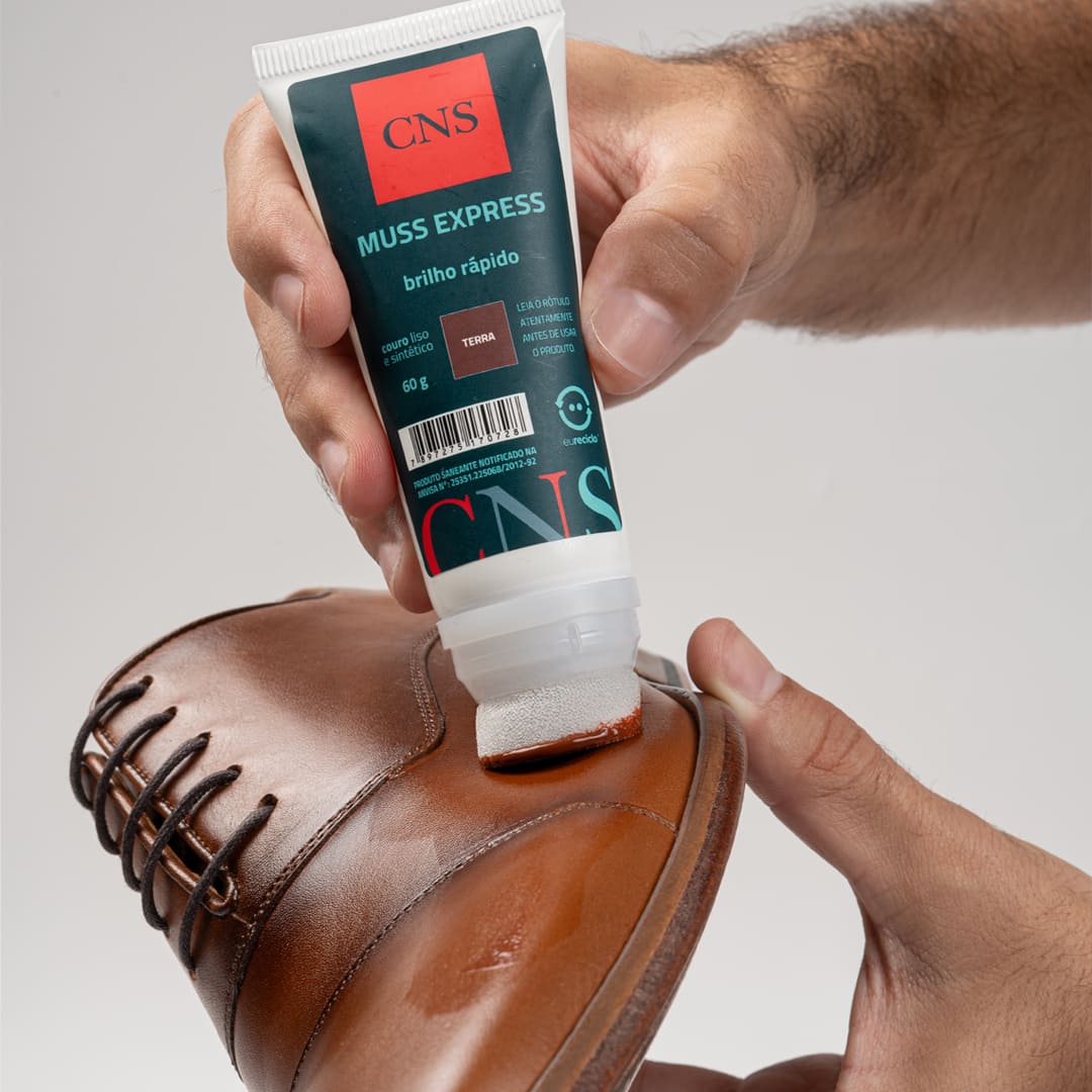 SOBRE O MUSS EXPRESS: Produto para polimento a base de ceras naturais e água. Pela sua formulação, recupera o brilho, a flexibilidade e hidratação natural de calçados em couro liso, podendo também ser utilizado em materiais sintéticos, tendo altíssimo rendimento e prolongada permanência sobre as superfícies tratadas. Não agride o couro. Fabricado em diversas cores, permite perfeita adaptação às cores originais, amaciando o couro a cada aplicação. De aplicação prática, hidrata o couro e cobre arranhões (exceto incolor).