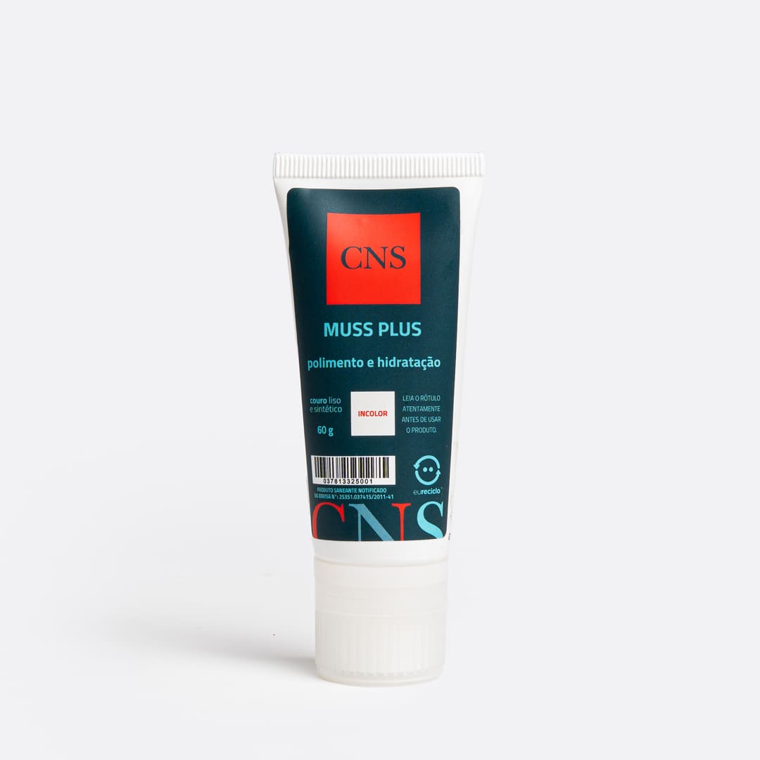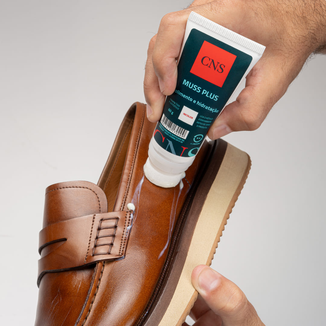 SOBRE O MUSS PLUS: Produto para polimento a base de ceras naturais e água. Pela sua formulação, recupera o brilho, a flexibilidade e hidratação natural de calçados em couro liso, podendo também ser utilizado em materiais sintéticos, tendo altíssimo rendimento e prolongada permanência sobre as superfícies tratadas. Não agride o couro. Fabricado em diversas cores, permite perfeita adaptação às cores originais, amaciando o couro a cada aplicação. De aplicação prática, hidrata o couro e cobre arranhões (exceto incolor). Para obter um brilho natural, lustrar após aplicação.