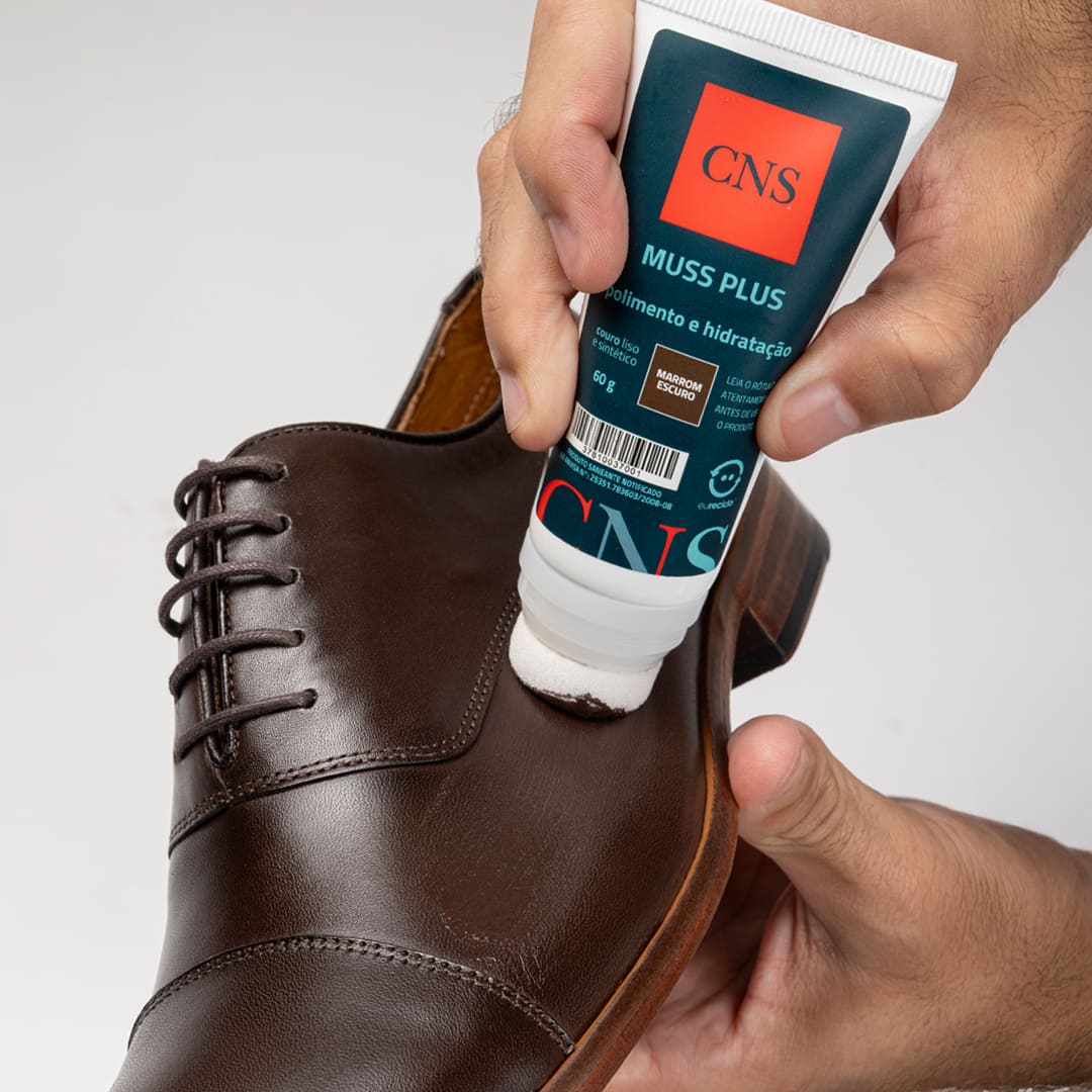 SOBRE O MUSS PLUS: Produto para polimento a base de ceras naturais e água. Pela sua formulação, recupera o brilho, a flexibilidade e hidratação natural de calçados em couro liso, podendo também ser utilizado em materiais sintéticos, tendo altíssimo rendimento e prolongada permanência sobre as superfícies tratadas. Não agride o couro. Fabricado em diversas cores, permite perfeita adaptação às cores originais, amaciando o couro a cada aplicação. De aplicação prática, hidrata o couro e cobre arranhões (exceto incolor). Para obter um brilho natural, lustrar após aplicação.