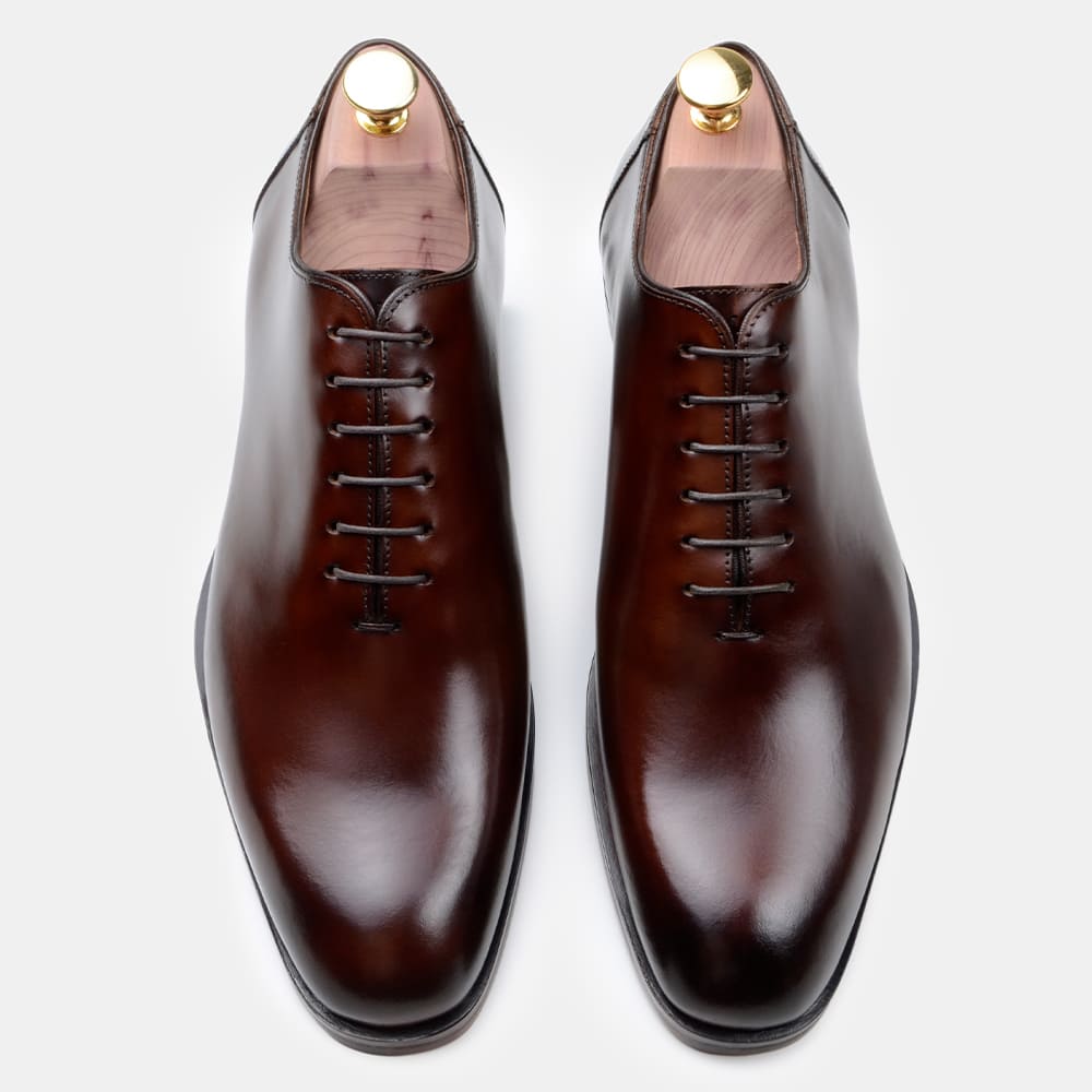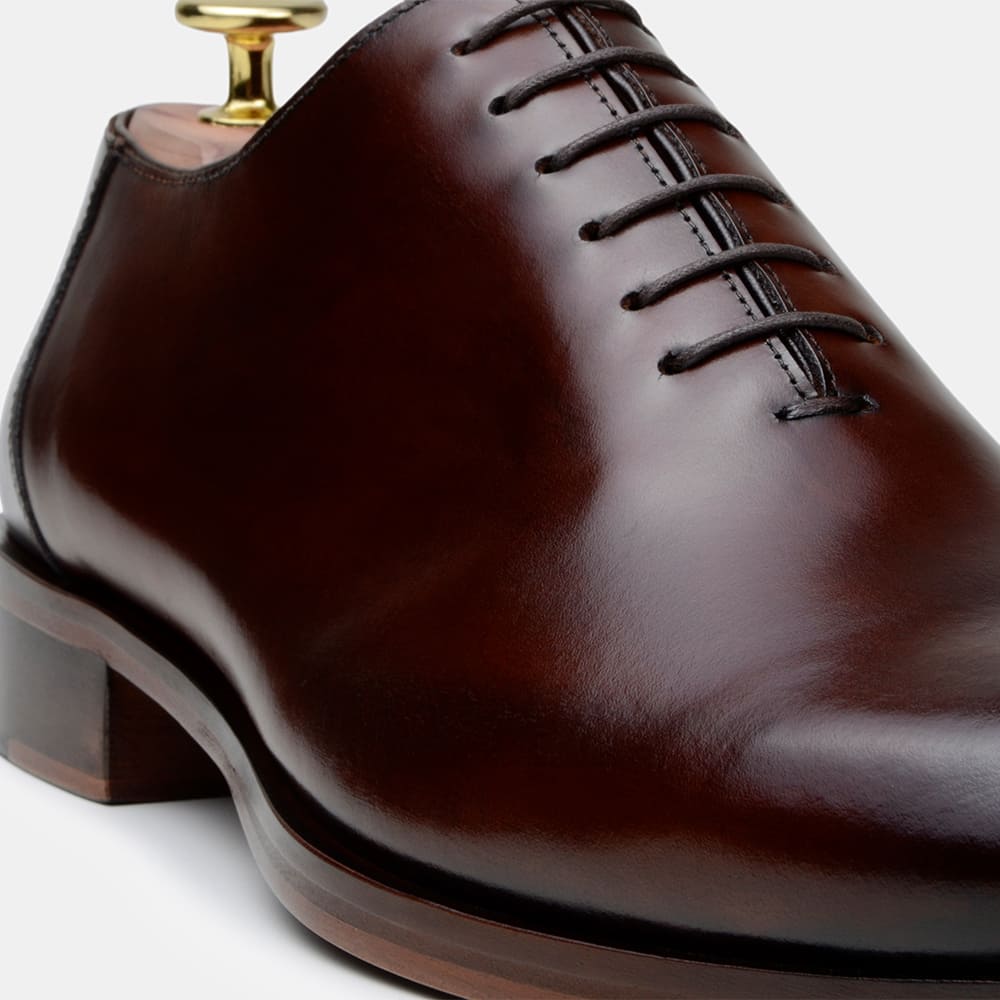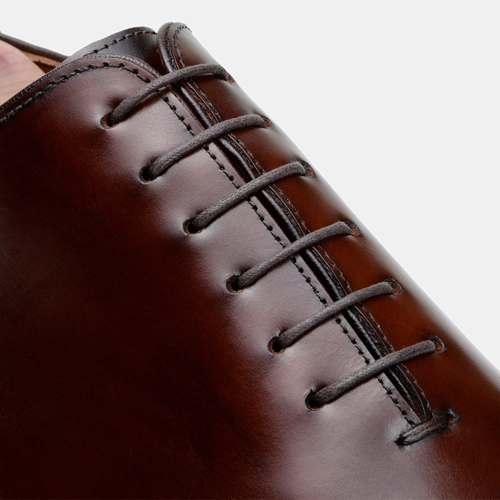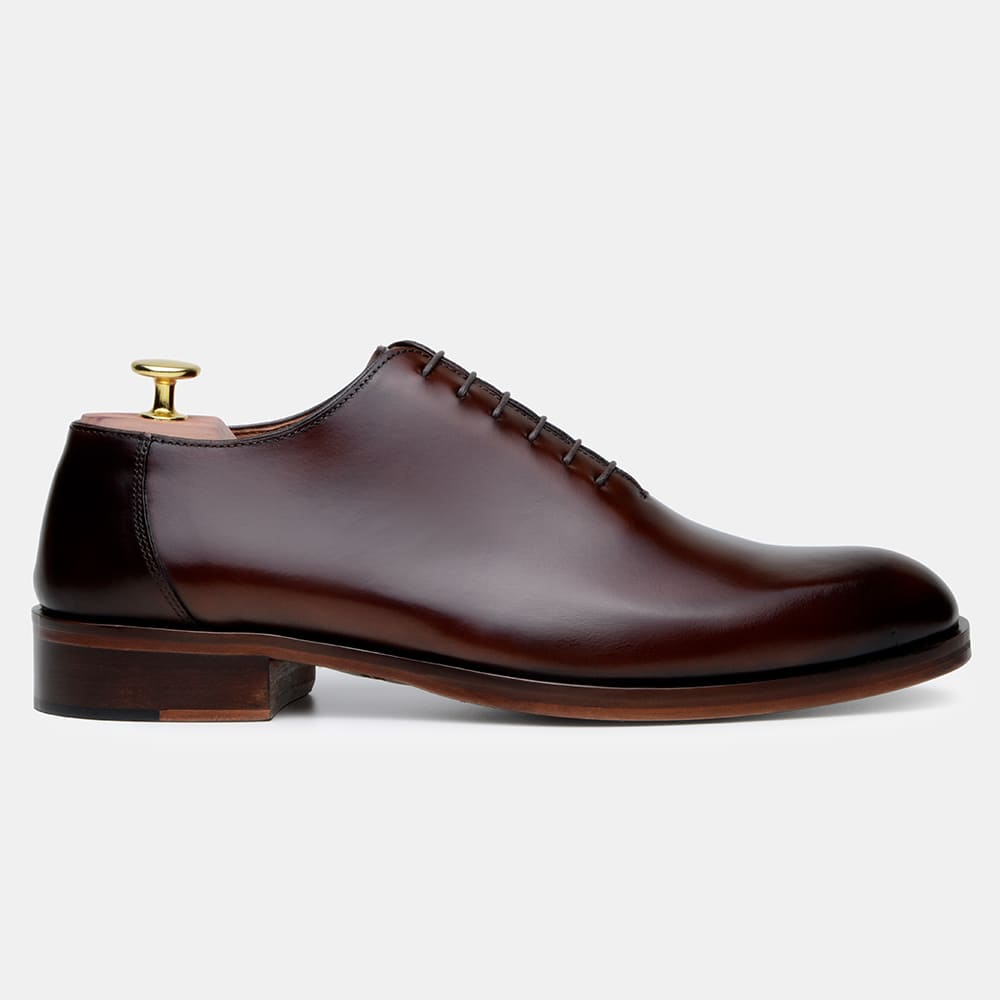 CABEDAL: Sapato modelo Wholecut, fabricado em couro bovino de alta qualidade com acabamento Machiatto (pintado à mão) na cor Whisky;