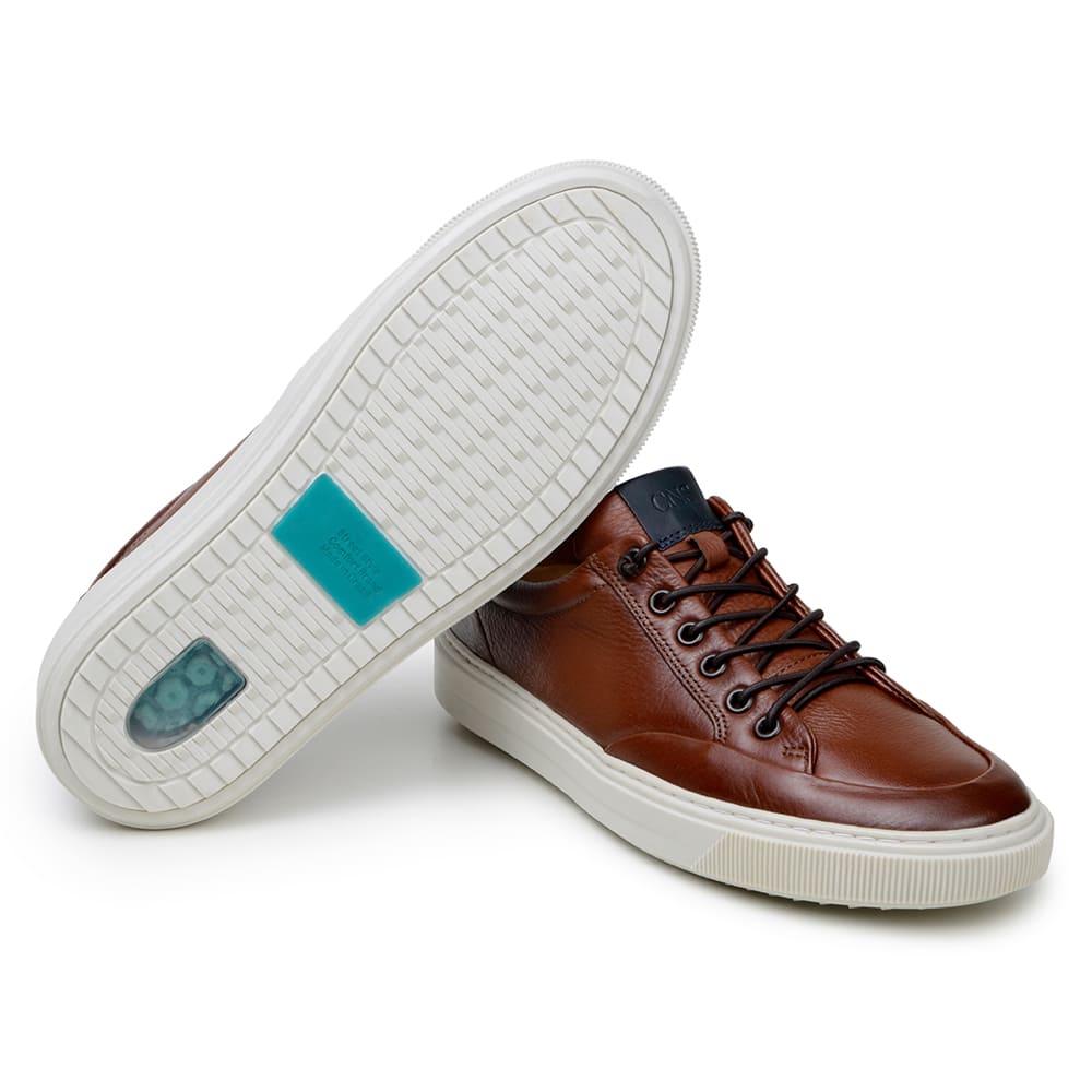 PALMILHA: Palmilha anatômica em couro cor caramelo com espuma de alta densidade para maior conforto e absorção de impactos;
